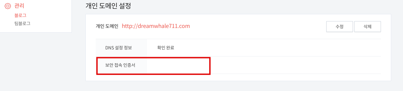 티스토리 관리자 화면 ▶ 관리 ▶ 블로그 ▶ 개인도메인설정 메뉴에 들어가서 '보안접속인증서'를 삭제 후