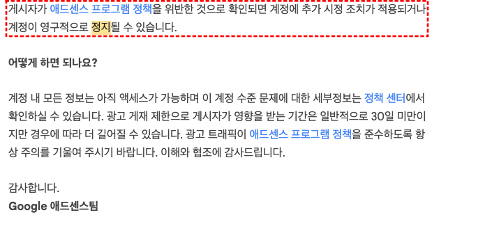 광고가 정지되고, 애드센스 프로그램 정책을 위반한 것으로 확인되면, 아래와 같은 내용의 이메일이 옵니다.