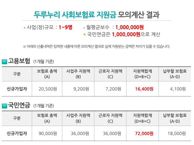 월 급여 100만 원을 받는 근로자의 연금보험료는 월 고용보험료 16,400원이 지원되며,