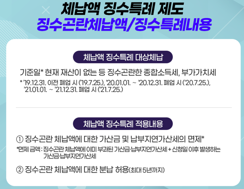 3. 종합소득세와 부가가치세의 체납 합계약이 5천만 원 이하여야 합니다. (신청일 현재, 종합소득세와 부가가치세 체납액 합계액)