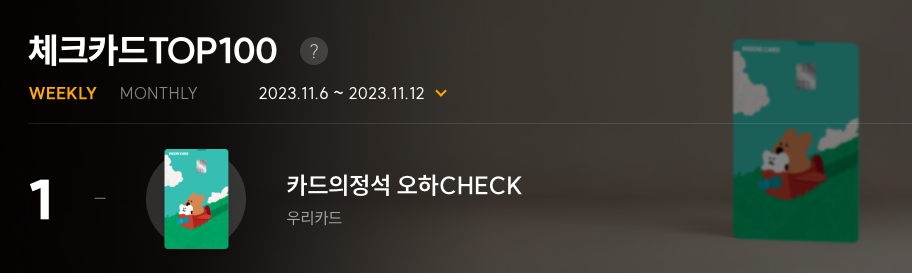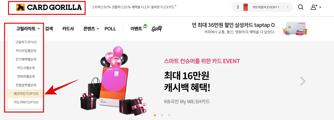 '카드고릴라'를 검색한 후, 체크카드 TOP100을 살펴보시면 됩니다.