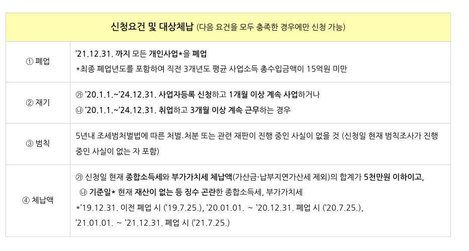 3. 종합소득세와 부가가치세의 체납 합계약이 5천만 원 이하여야 합니다. (신청일 현재, 종합소득세와 부가가치세 체납액 합계액)