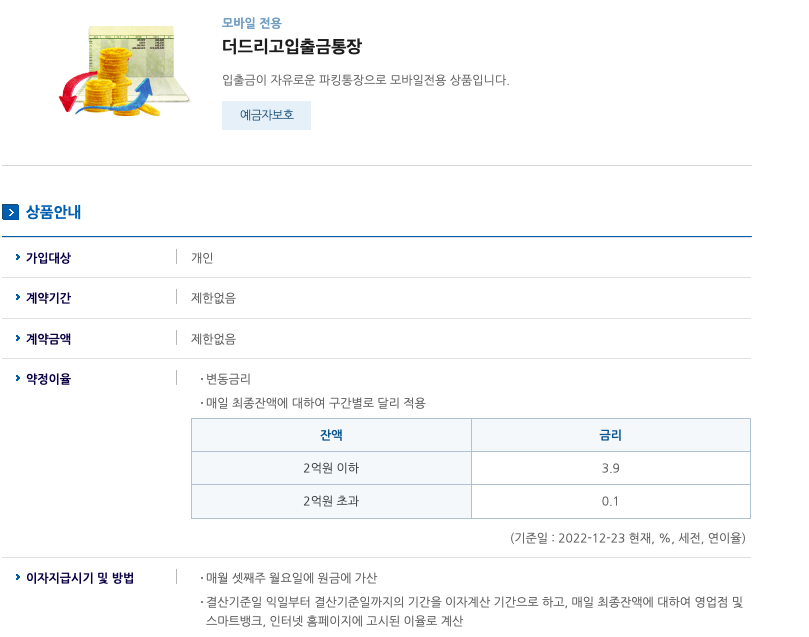 가입대상은 개인이며, 계약금액은 제한이 없습니다. 금리는 2억 원 이하는 3.9%, 2억원 초과는 연 0.1%지급합니다. 2억원 이상 넣을 필요는 없.... 겠네요. 이자지급시기는 매월 셋째 주 월요일입니다. 가입방법은 스마트뱅크 비대면으로만 가능합니다.
